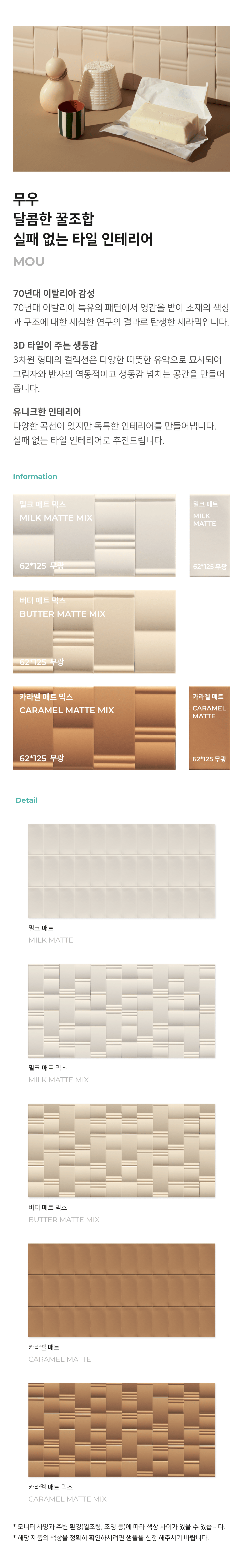 MOU 시리즈는 70년대 이탈리아 특유의 패턴에서 영감을 받아 소재의 색상과 재료의 구조에 대한 세심한 연구 결과로 탄생한 타일입니다. 올록볼록 입체감을 갖춘 MIX 타일과 플랫한 타일을 조합해 나만의 패턴으로 유니크한 공간으로 연출할 수 있습니다. 따뜻한 색감과 질감이 부드러운 것이 특징입니다.