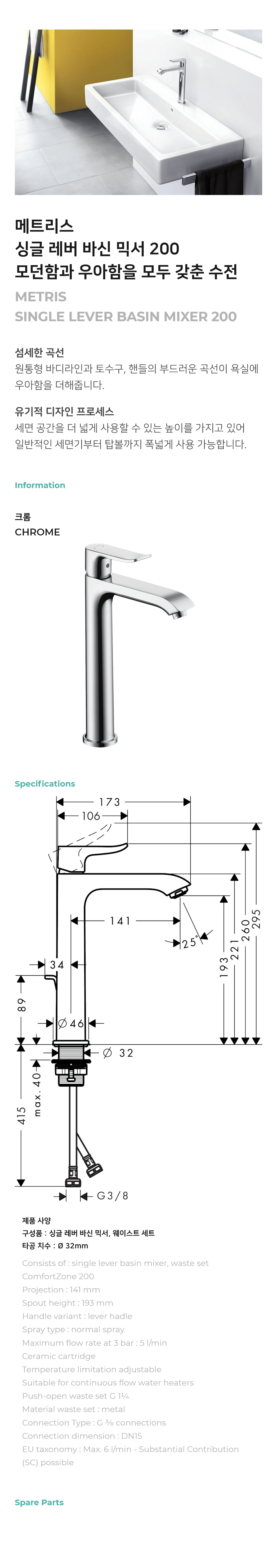 메트리스 싱글 레버 세면 수전 200(Metris Single lever basin mixer 200) - 31183000