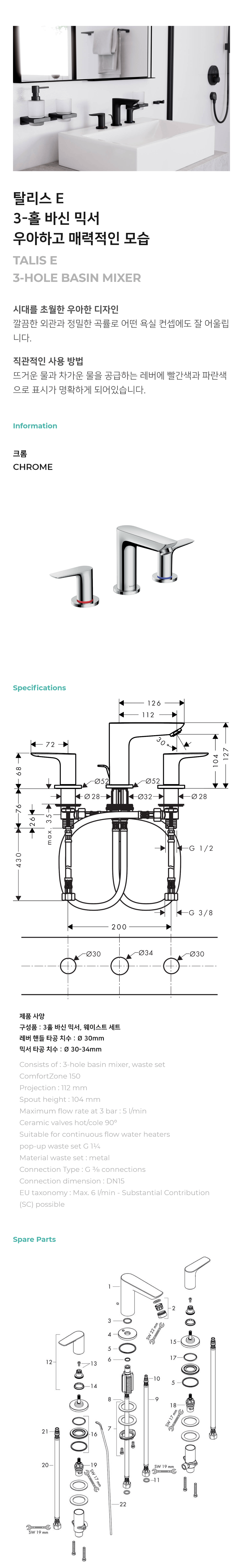 탈리스 E 3홀 세면 수전(Talis E 3-hole basin mixer) - 71733000