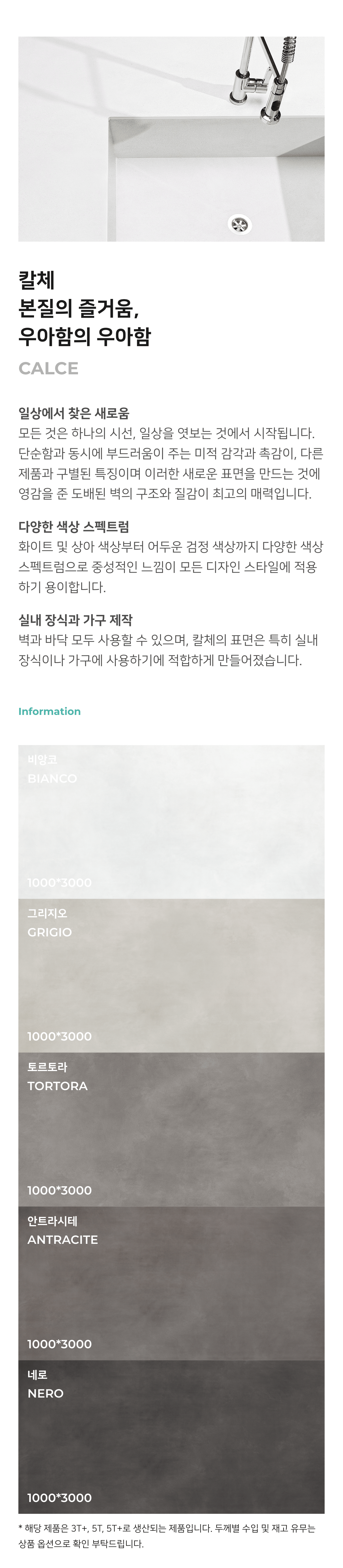 표면 가공 방식에 따라 유광, 무광, 반광, 거친 표면 등 다양한 마감이 적용되어 공간의 분위기와 사용 환경에 영향을 줍니다.