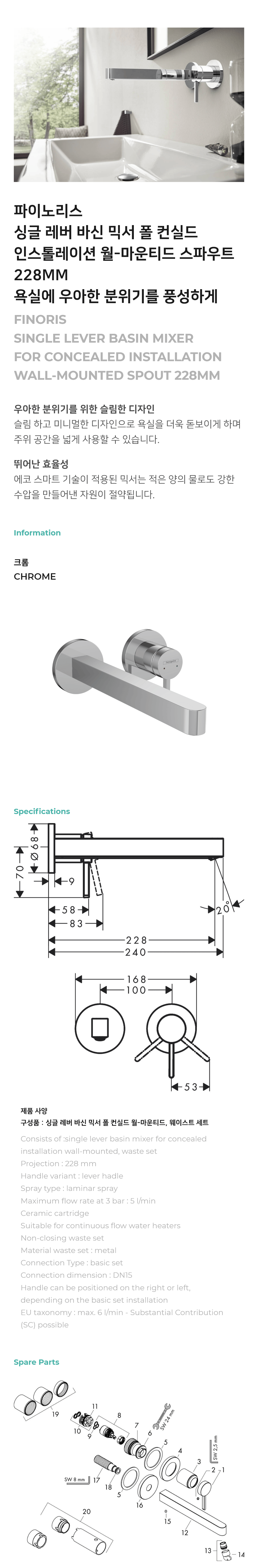파이노리스 싱글 레버 바신 믹서 벽 매립 설치형 (Finoris Single lever basin mixer for concealed installation wall-mounted) - 76050000